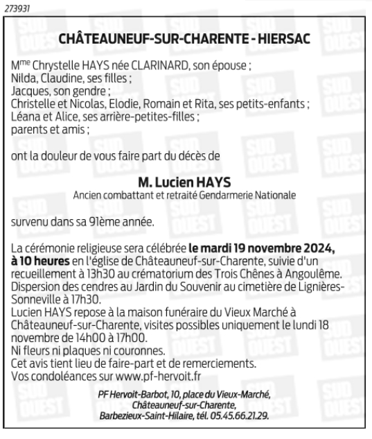 Décédé à Saint-Michel (16470, France) le mercredi 13 novembre 2024 à l'âge de 90 ans