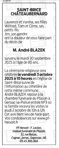 Décédé à Châteaubernard (16100, France) le mardi 30 septembre 2025 à l'âge de 80 ans