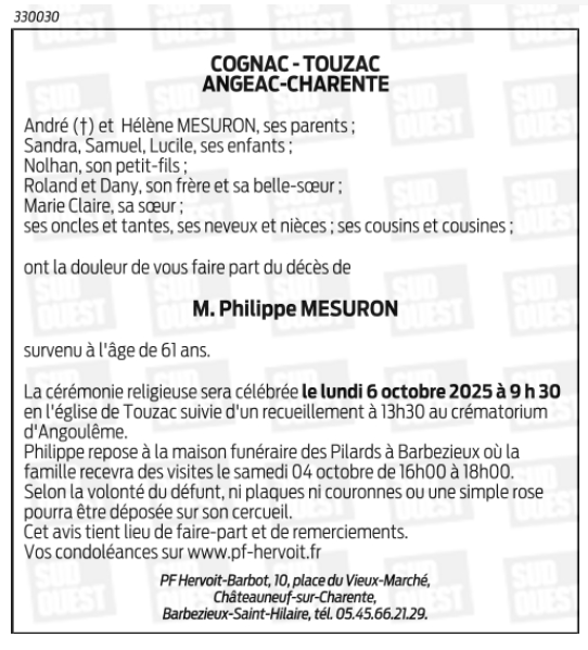 Décédé à Cognac (16100, France) le mardi 30 septembre 2025 à l'âge de 61 ans