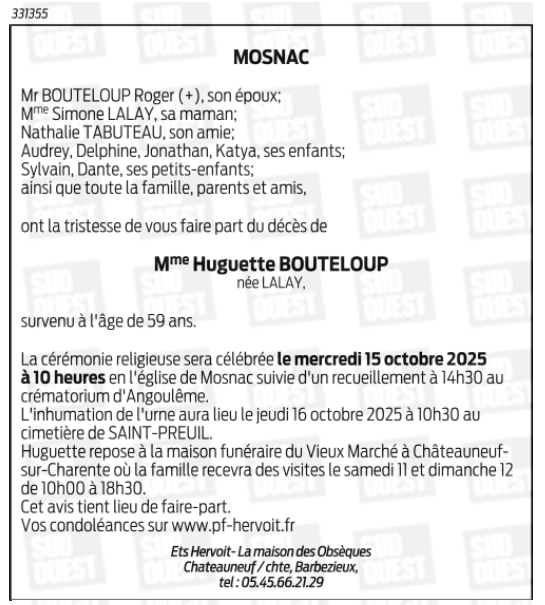 Décédée à Saint-Michel (16470, France) le jeudi 9 octobre 2025 à l'âge de 59 ans