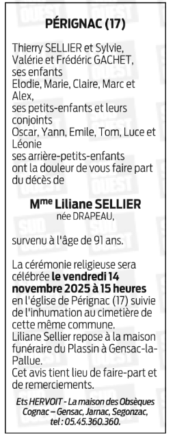 Décédée à Segonzac (16130, France) le mardi 11 novembre 2025 à l'âge de 91 ans