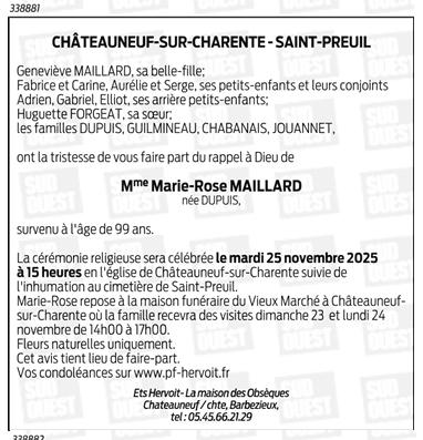 Décédée à Châteauneuf-sur-Charente (16120, France) le vendredi 21 novembre 2025 à l'âge de 99 ans