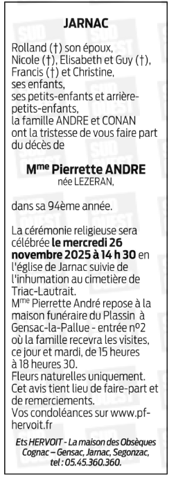 Décédée à Châteauneuf-sur-Charente (16120, France) le samedi 22 novembre 2025 à l'âge de 93 ans
