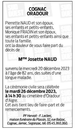 Née à Oradour (16140, France) le mardi 10 juin 1941