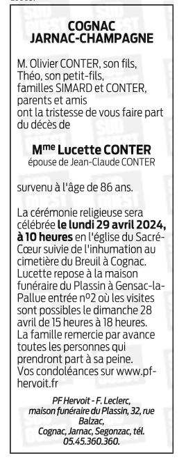 Décédée à Châteaubernard (16100, France) le jeudi 25 avril 2024 à l'âge de 86 ans