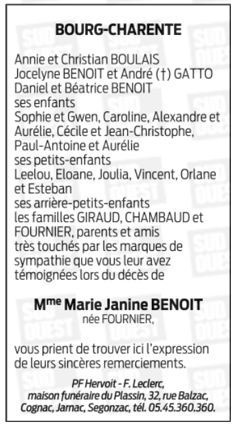 Décédée à Bourg-Charente (16200, France) le dimanche 29 janvier 2023 à l'âge de 90 ans