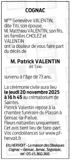 Décédé à Cognac (16100, France) le vendredi 14 novembre 2025 à l'âge de 73 ans