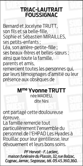 Née à Triac-Lautrait (16200, France) le dimanche 17 mai 1925