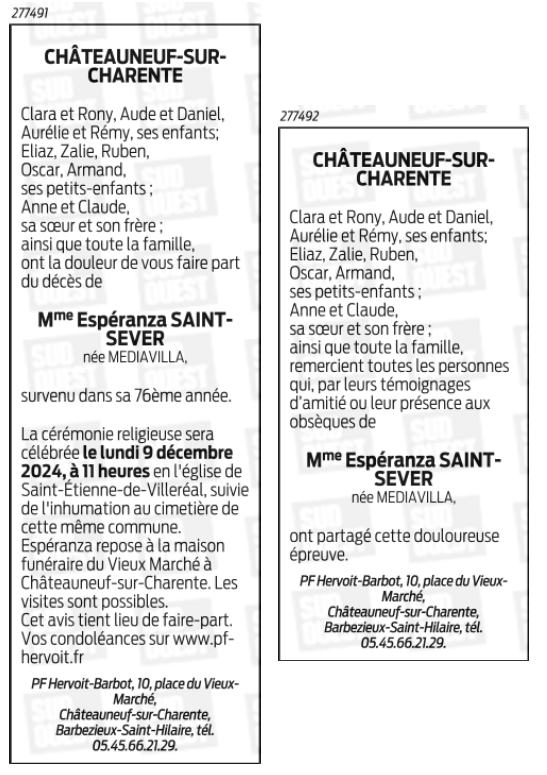 Décédée à Barbezieux-Saint-Hilaire (16300, France) le lundi 2 décembre 2024 à l'âge de 75 ans