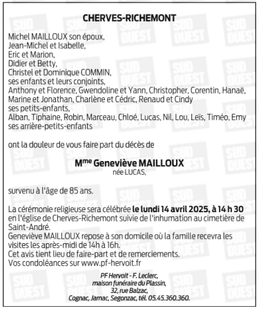 Décédée à Châteaubernard (16100, France) le mercredi 9 avril 2025 à l'âge de 85 ans