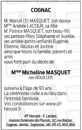 Décédée à Châteaubernard (16100, France) le dimanche 19 février 2023 à l'âge de 93 ans