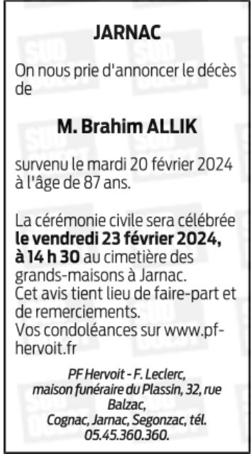 Décédé à Saint-Yrieix-sur-Charente (16710, France) le mardi 20 février 2024 à l'âge de 87 ans