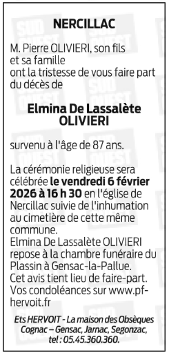 Décédée à Châteaubernard (16100, France) le samedi 31 janvier 2026 à l'âge de 87 ans