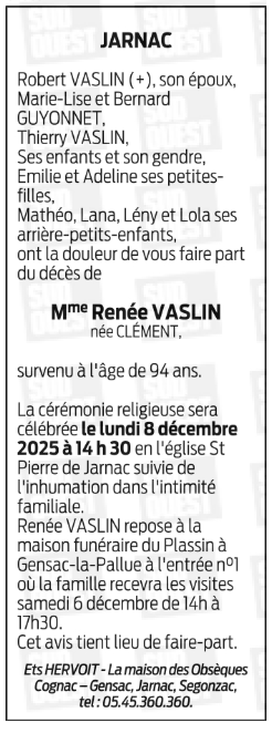 Décédée à Châteaubernard (16100, France) le mercredi 3 décembre 2025 à l'âge de 94 ans