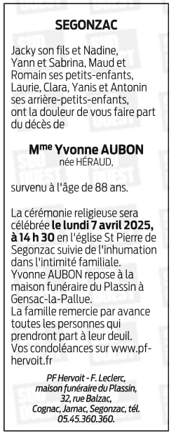Décédée à Saint-Michel (16470, France) le mardi 1 avril 2025 à l'âge de 88 ans