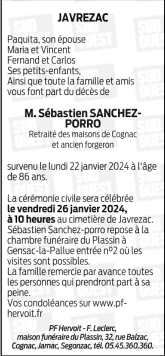 Décédé à Javrezac (16100, France) le lundi 22 janvier 2024 à l'âge de 86 ans