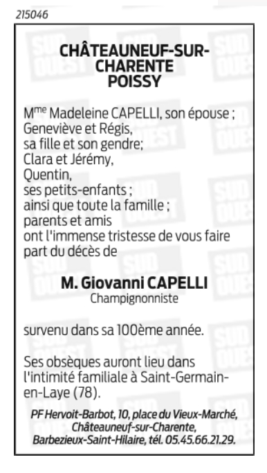 Décédé à Châteauneuf-sur-Charente (16120, France) le jeudi 14 décembre 2023 à l'âge de 99 ans