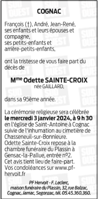 Décédée à Rouillac (16170, France) le mercredi 27 décembre 2023 à l'âge de 94 ans