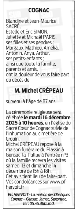 Décédé à Saint-Yrieix-sur-Charente (16710, France) le jeudi 11 décembre 2025 à l'âge de 87 ans