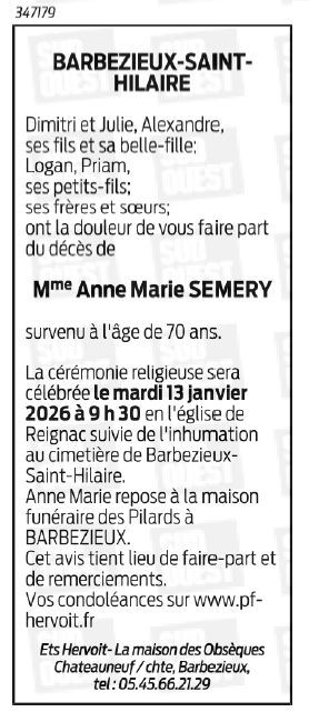 Décédée à Barbezieux-Saint-Hilaire (16300, France) le mardi 6 janvier 2026 à l'âge de 70 ans