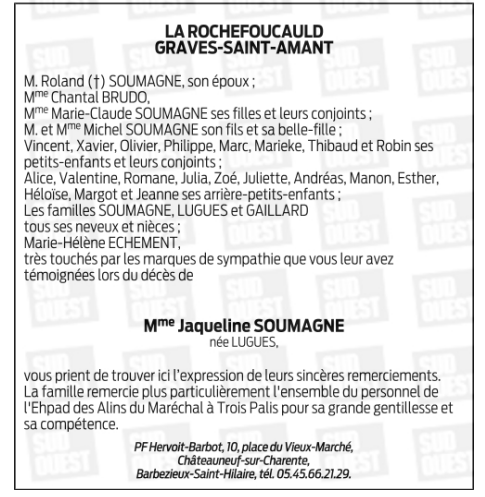 Madame Jacqueline SOUMAGNE née LUGUES