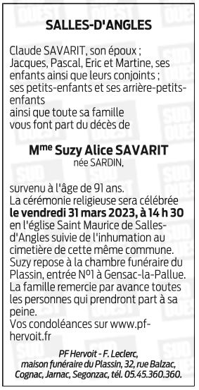 Décédée à Châteauneuf-sur-Charente (16120, France) le samedi 25 mars 2023 à l'âge de 91 ans