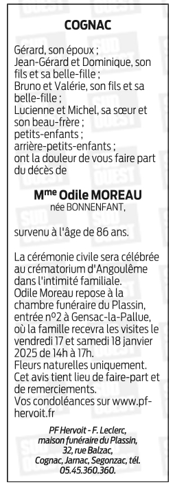 Décédée à Châteaubernard (16100, France) le dimanche 12 janvier 2025 à l'âge de 86 ans