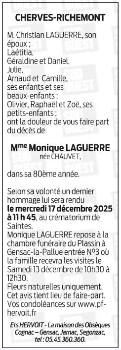 Décédée à Châteaubernard (16100, France) le mercredi 10 décembre 2025 à l'âge de 79 ans
