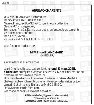Décédée à Châteauneuf-sur-Charente (16120, France) le vendredi 14 mars 2025 à l'âge de 97 ans