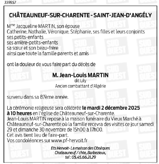 Décédé à Châteauneuf-sur-Charente (16120, France) le jeudi 27 novembre 2025 à l'âge de 86 ans