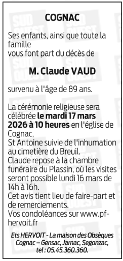Décédé à Cognac (16100, France) le mercredi 11 mars 2026 à l'âge de 89 ans