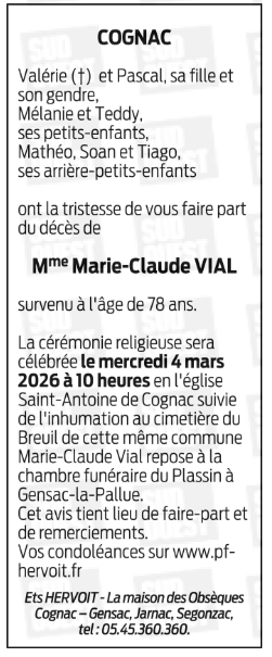 Décédée à Châteaubernard (16100, France) le jeudi 26 février 2026 à l'âge de 78 ans