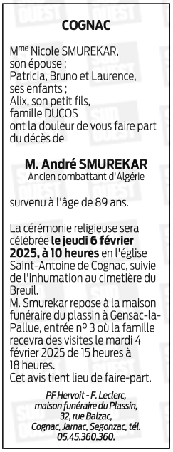 Décédé à Châteaubernard (16100, France) le samedi 1 février 2025 à l'âge de 89 ans