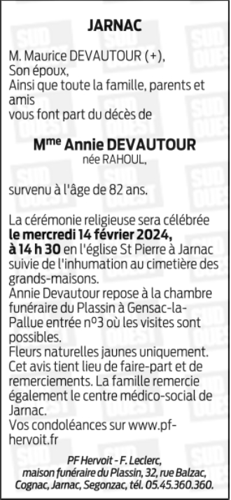 Madame Annie DEVAUTOUR née RAHOUL