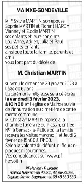 Décédé à Châteaubernard (16100, France) le dimanche 29 janvier 2023 à l'âge de 67 ans