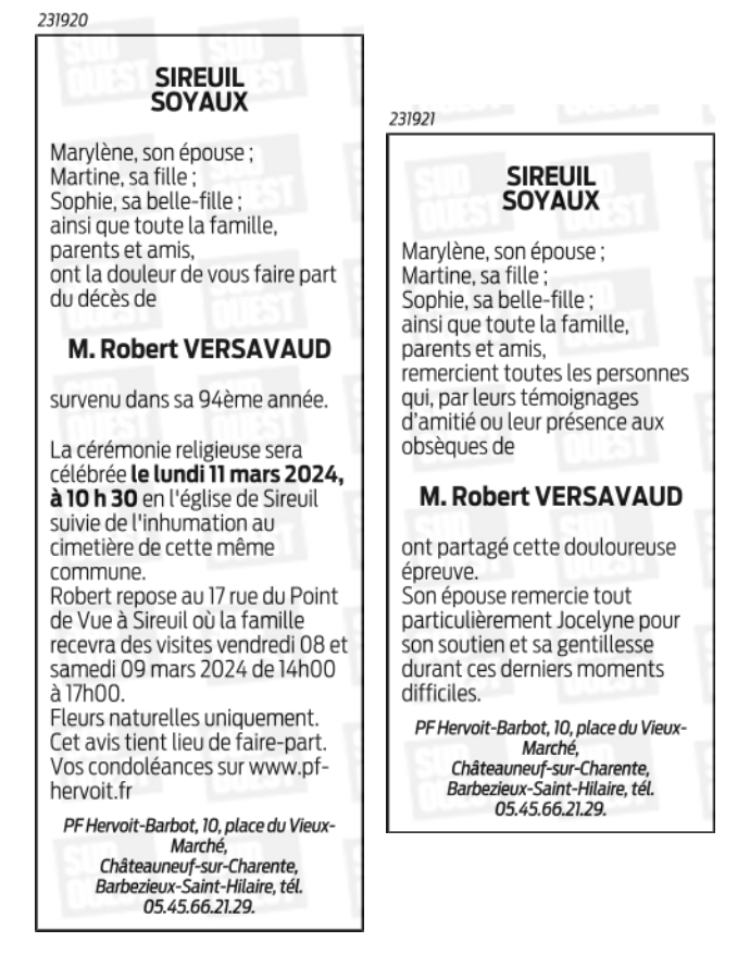 Décédé à Sireuil (16440, France) le mardi 5 mars 2024 à l'âge de 93 ans