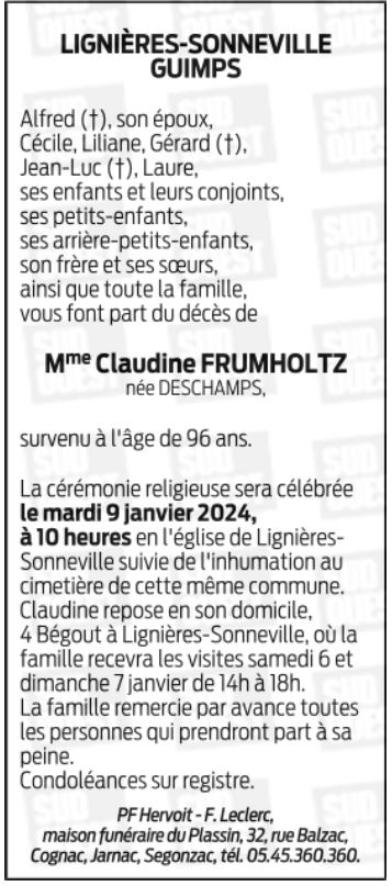 Décédée à Barbezieux-Saint-Hilaire (16300, France) le jeudi 4 janvier 2024 à l'âge de 95 ans