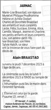 Décédé à Saint-Michel (16470, France) le jeudi 7 décembre 2023 à l'âge de 84 ans