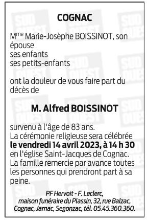 Décédé à Châteaubernard (16100, France) le vendredi 7 avril 2023 à l'âge de 83 ans