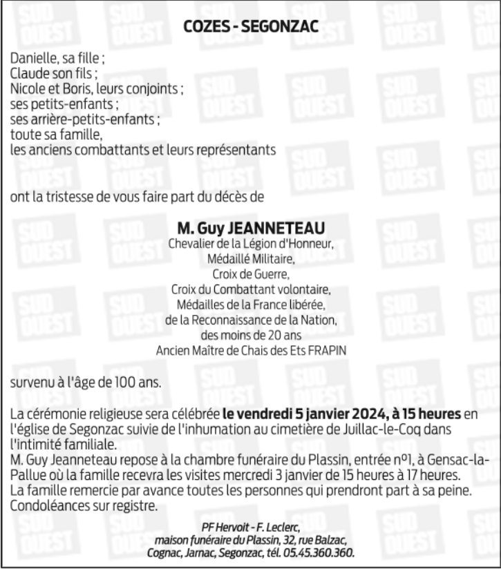 Décédé à Cozes (17120, France) le samedi 30 décembre 2023 à l'âge de 100 ans
