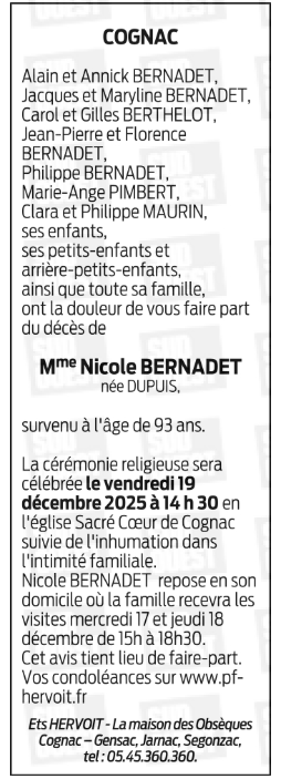 Décédée à Cognac (16100, France) le dimanche 14 décembre 2025 à l'âge de 92 ans
