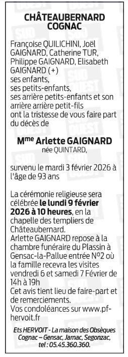 Décédée à Châteaubernard (16100, France) le mardi 3 février 2026 à l'âge de 93 ans