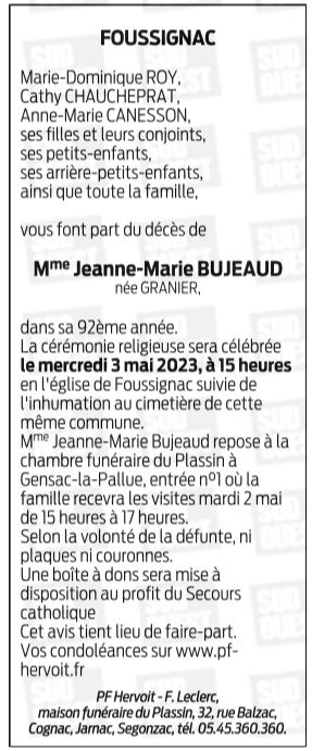 Décédée à Châteaubernard (16100, France) le samedi 29 avril 2023 à l'âge de 91 ans