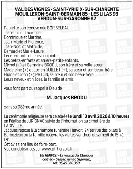Décédé à Barbezieux-Saint-Hilaire (16300, France) le lundi 6 avril 2026 à l'âge de 97 ans