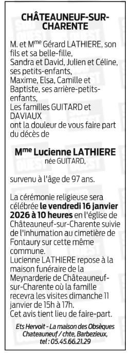Décédée à Châteauneuf-sur-Charente (16120, France) le vendredi 9 janvier 2026 à l'âge de 97 ans