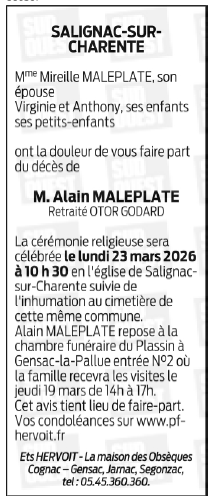 Décédé à Châteaubernard (16100, France) le mardi 17 mars 2026 à l'âge de 73 ans
