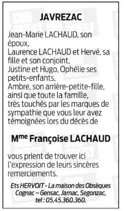 Décédée à Javrezac (16100, France) le mercredi 28 janvier 2026 à l'âge de 79 ans