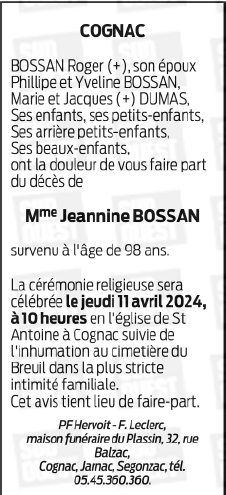 Décédée à Châteauneuf-sur-Charente (16120, France) le mardi 9 avril 2024 à l'âge de 98 ans