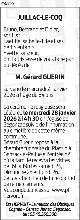 Décédé à Juillac-le-Coq (16130, France) le mercredi 21 janvier 2026 à l'âge de 84 ans