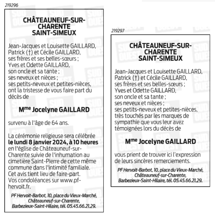 Décédée à Châteauneuf-sur-Charente (16120, France) le jeudi 4 janvier 2024 à l'âge de 64 ans